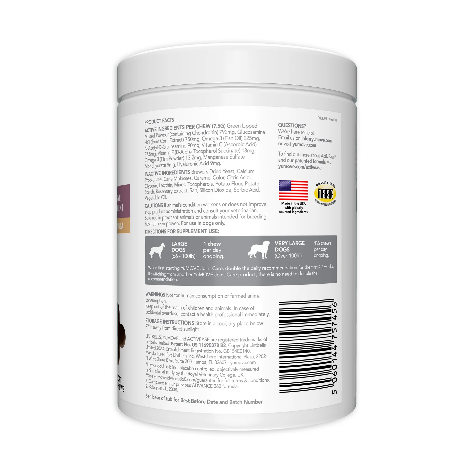 YuMOVE ADVANCE 360 Max Strength е хранителна добавка с най-висока концентрация на екстракт от новозеландска зеленоуста мида ActivEase®, клинично доказано ефект след само 6 седмици, и се предлага изключително от ветеринарни клиники. Предназначена е за кучета под ветеринарен надзор, които изпитват скованост и болка в ставите.